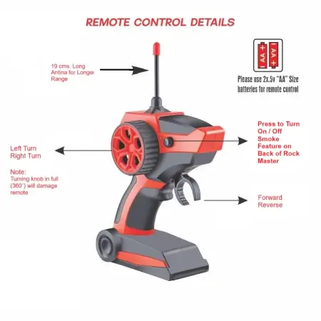 The Remote Control Rock Crawler offers full control to move **Forward/Backward**, **Turn Left/Right**, and even has an **Auto Function** where the car will move automatically after pressing the button. It includes a **3.6V rechargeable battery** (for the car) and requires **2 x AA Batteries** (not included) for the remote controller.