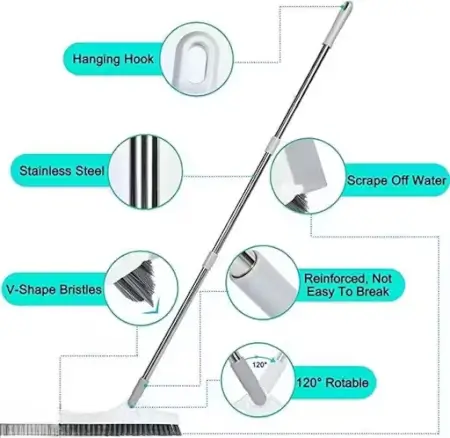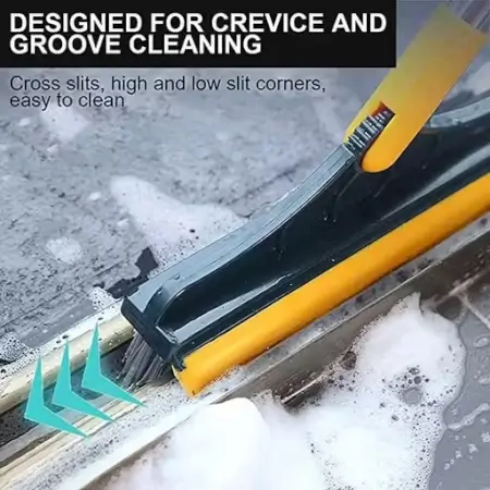 Dual-function bathroom cleaning brush with stainless-steel handle and wiper blade for effective tile and floor cleaning. Ideal for bathrooms and kitchens with 120° rotating head for flexibility.
